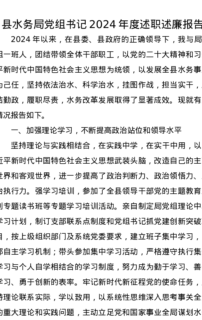 县水务局党组书记2024年度述职述廉报告
