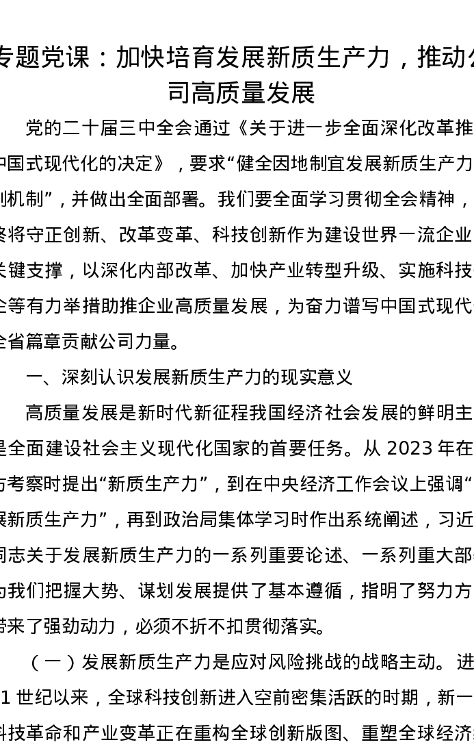 党课讲稿:加快培育发展新质生产力,推动公司高质量发展