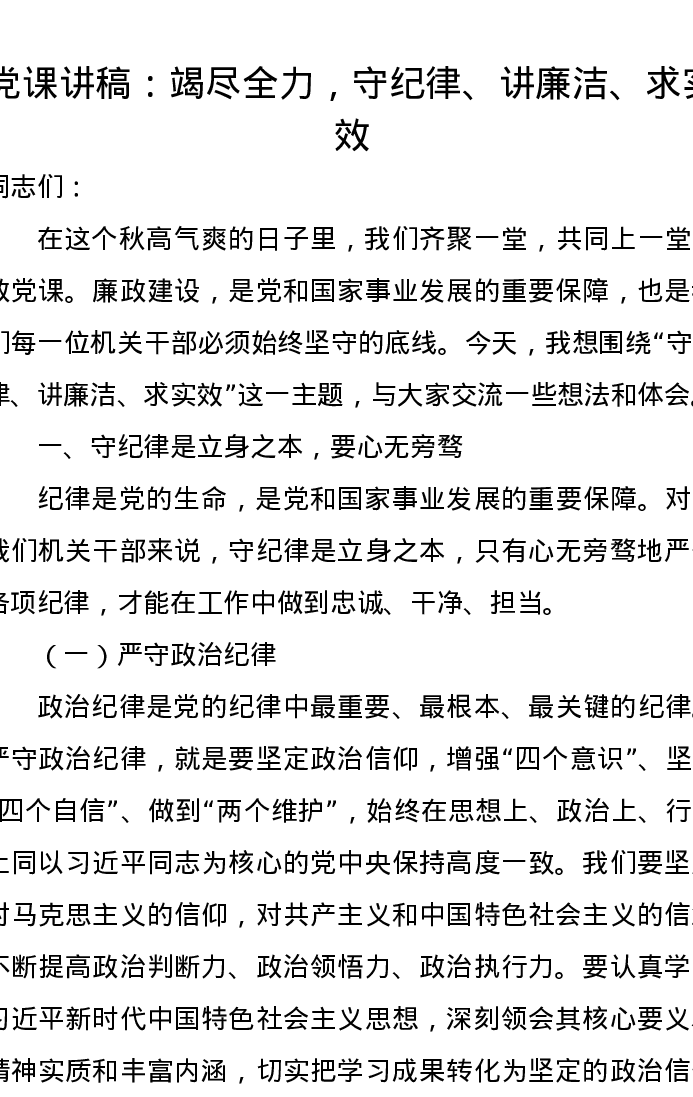 党课讲稿:竭尽全力, 守纪律、讲廉洁、求实效