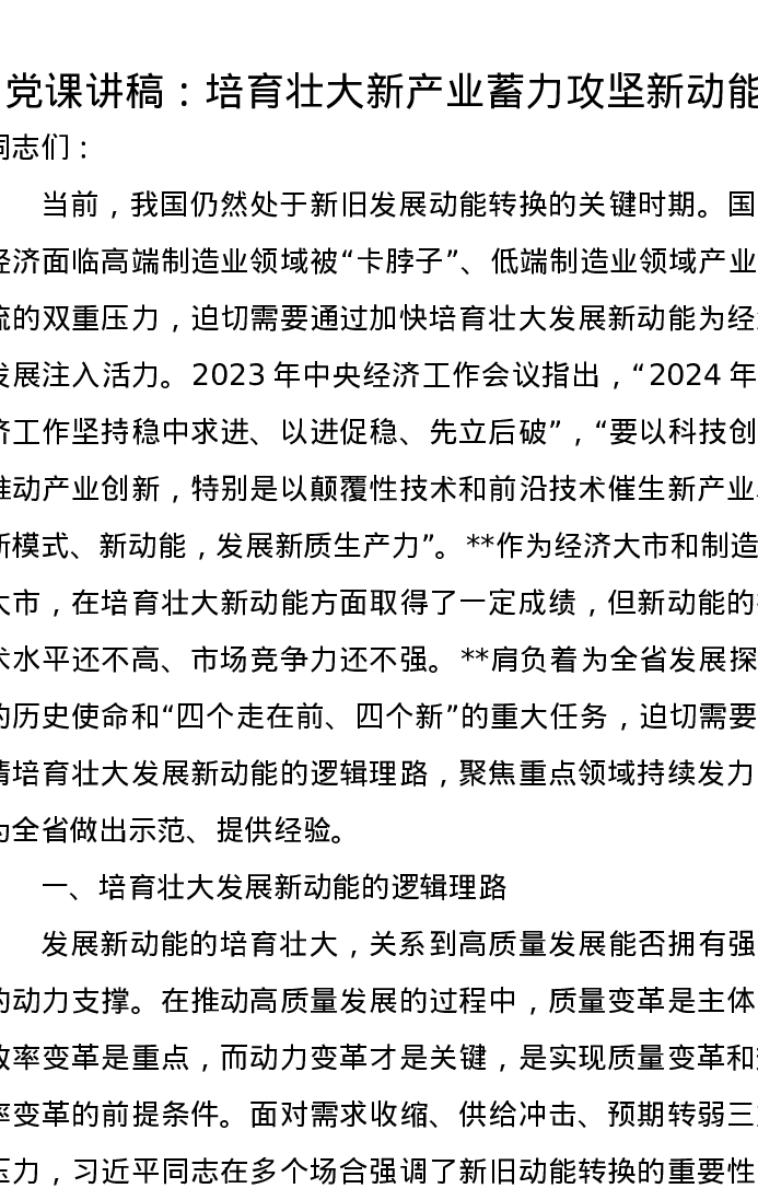 党课讲稿:培育壮大新产业蓄力攻坚新动能
