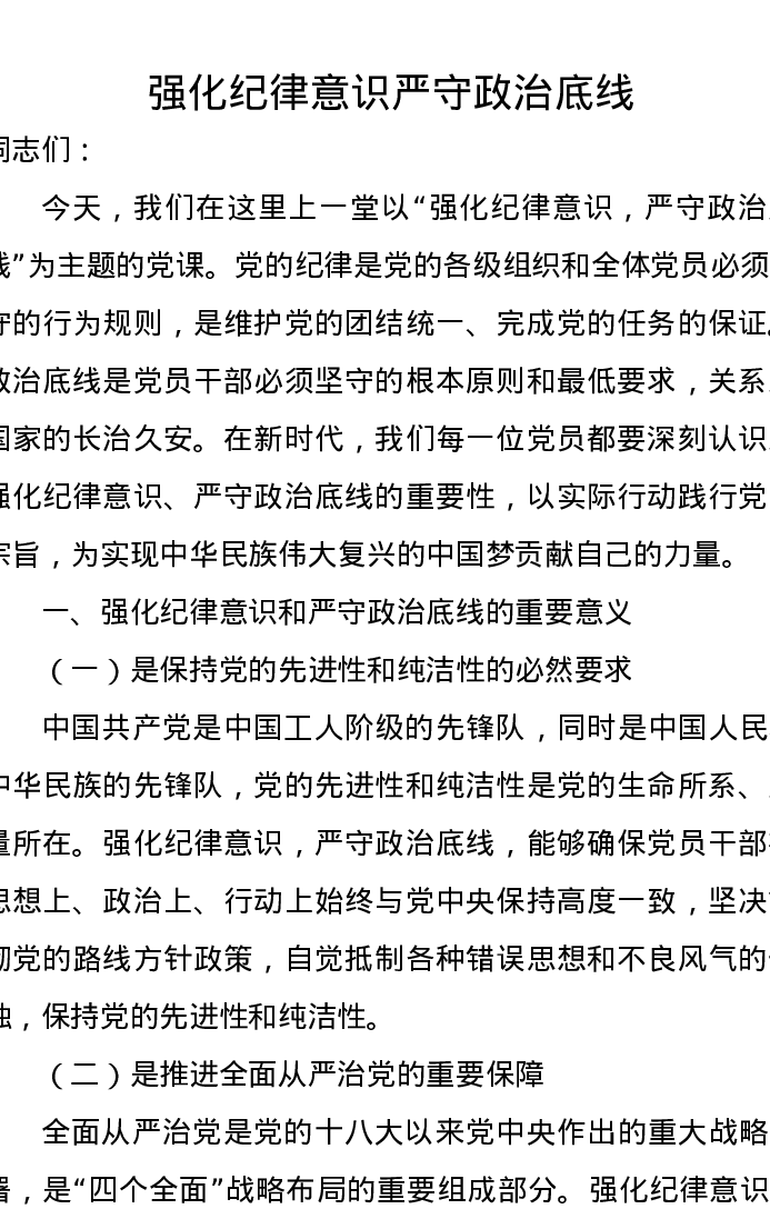 党课讲稿:强化纪律意识严守政治底线