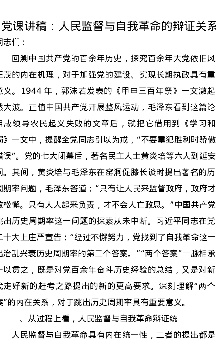 党课讲稿:人民监督与自我革命的辩证关系