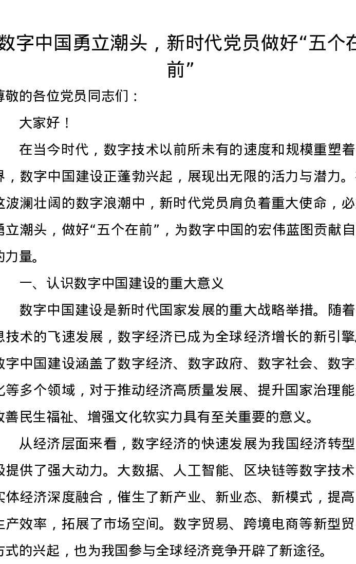 党课讲稿:数字中国勇立潮头,新时代党员做好 “五个在前”