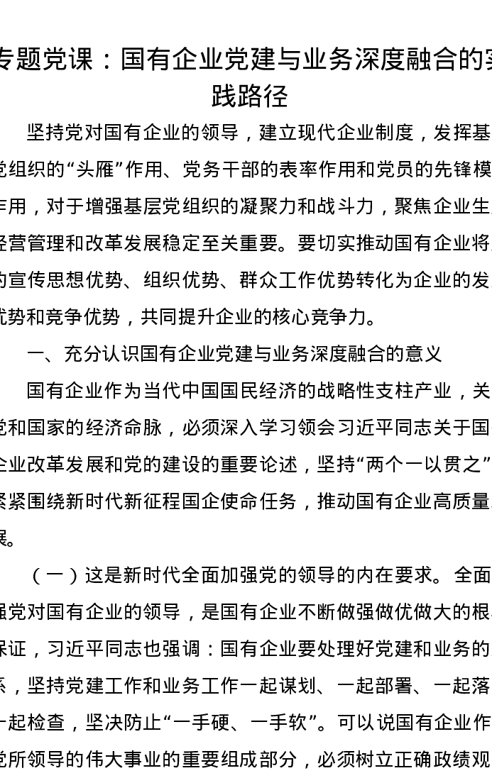 党课讲稿:国有企业党建与业务深度融合的实践路径