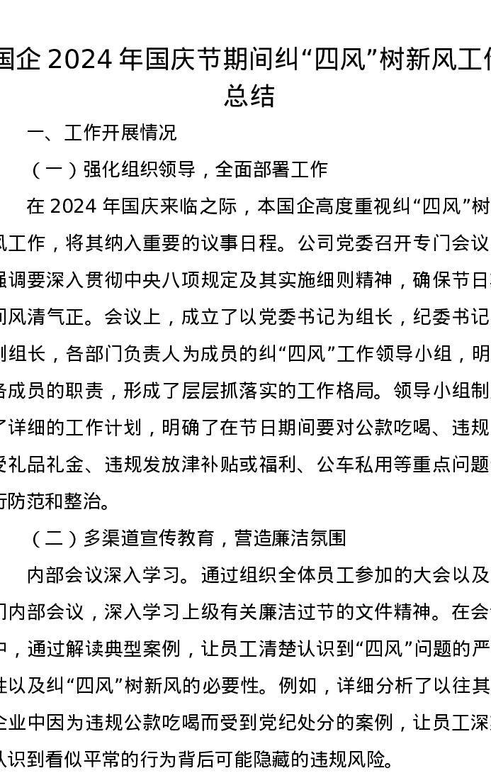 国企2024年国庆节期间纠“四风”树新风工作总结