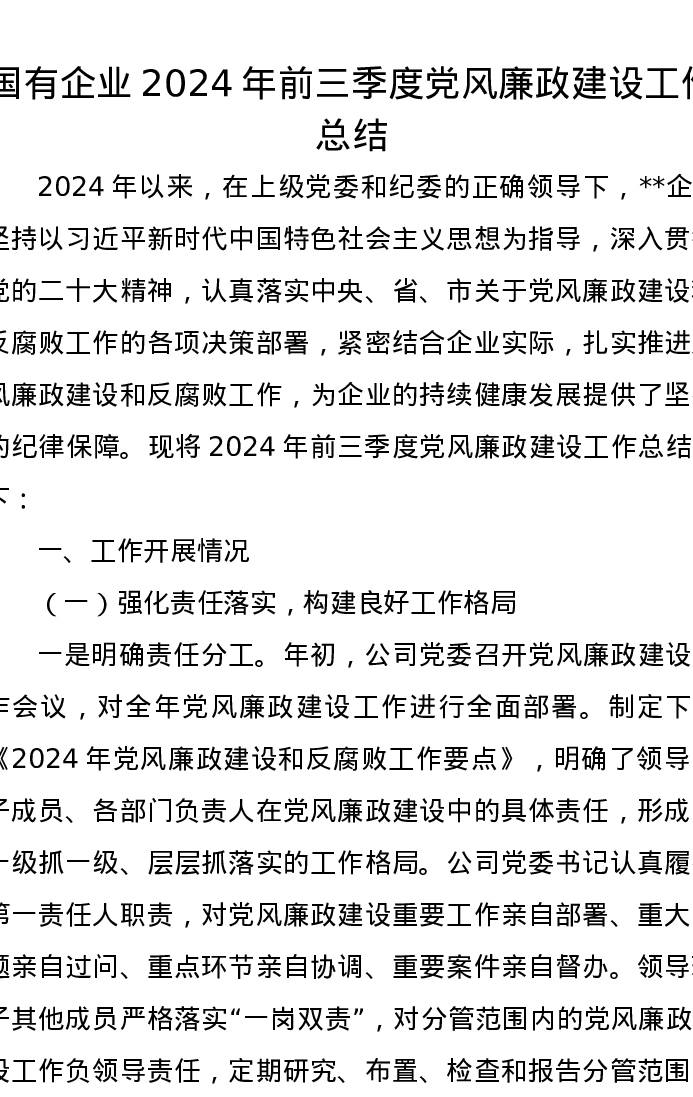 国有企业 2024 年前三季度党风廉政建设工作总结