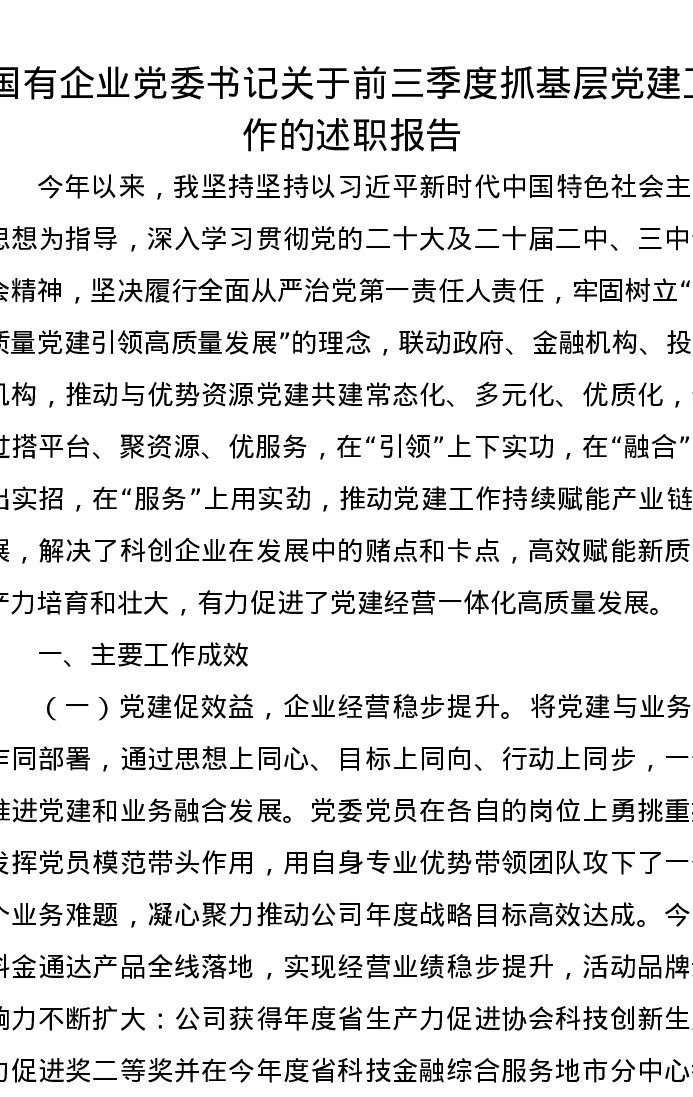 国有企业党委书记关于前三季度抓基层党建工作的述职报告