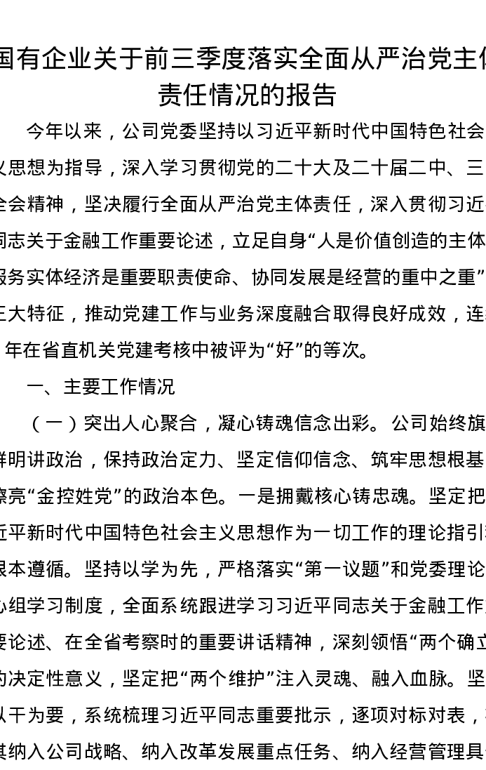 国有企业关于前三季度落实全面从严治党主体责任情况的报告
