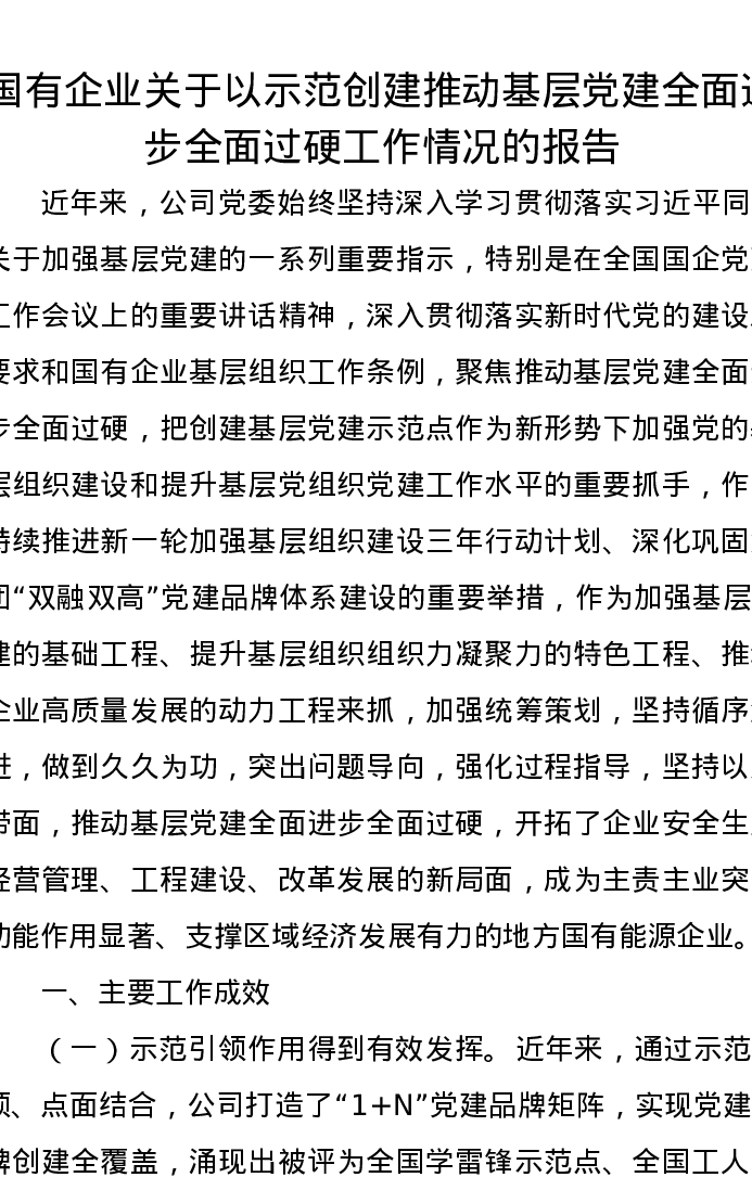 国有企业关于以示范创建推动基层党建全面进步全面过硬工作情况的报告