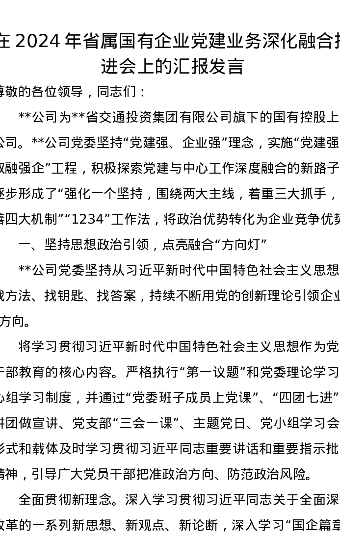 在2024年省属国有企业党建业务深化融合推进会上的汇报发言