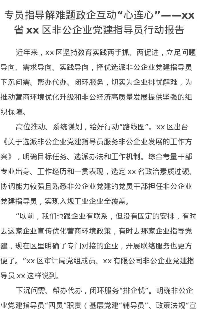 专员指导解难题政企互动“心连心”——xx省xx区非公企业党建指导员行动报告