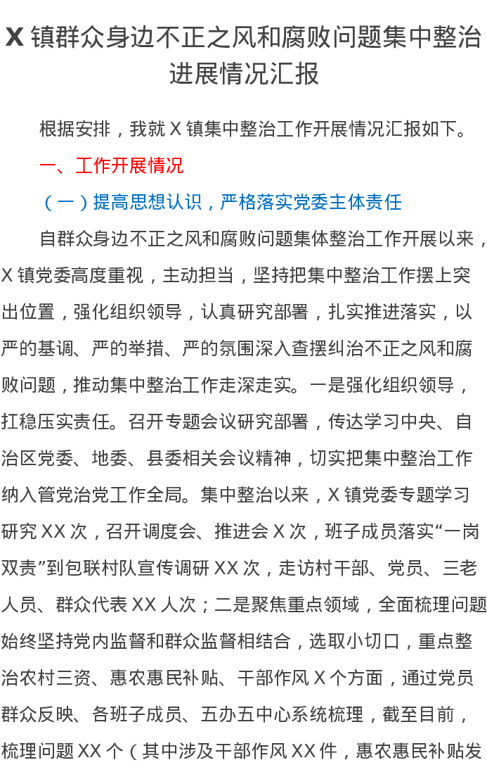 X镇群众身边不正之风和腐败问题集中整治进展情况汇报