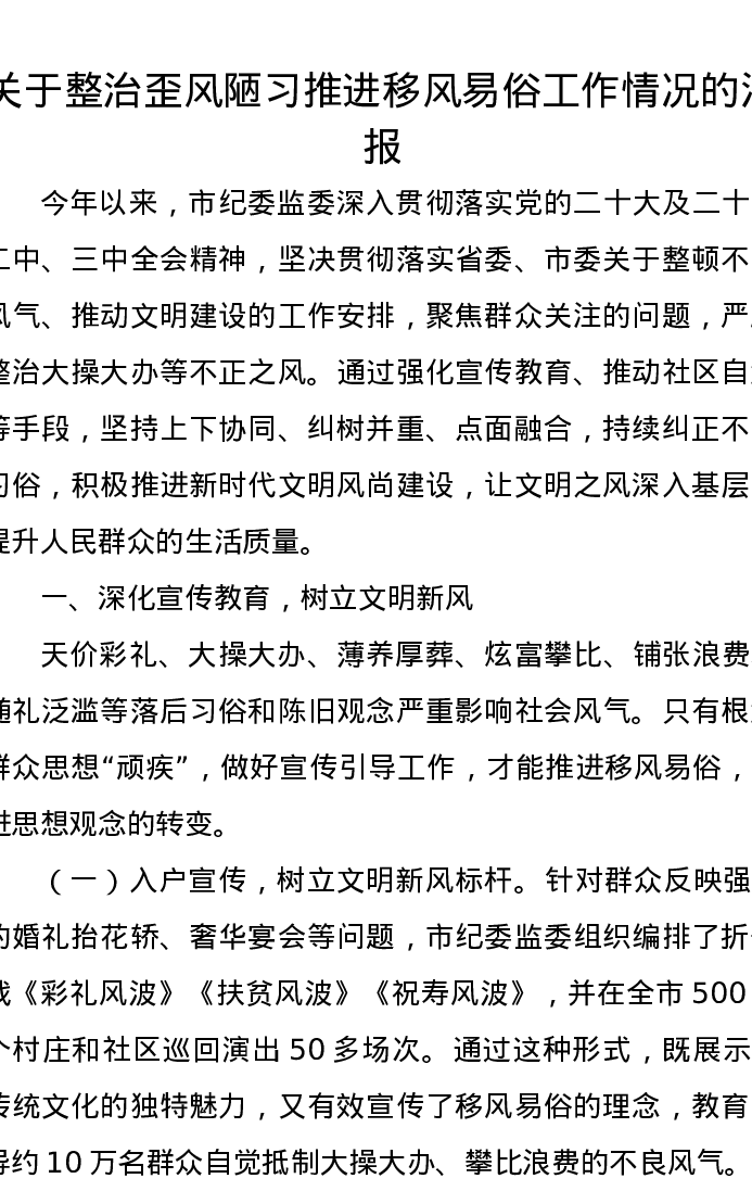 关于整治歪风陋习推进移风易俗工作情况的汇报2