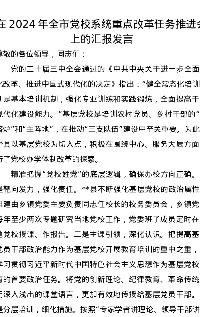 在2024年全市党校系统重点改革任务推进会上的汇报发言