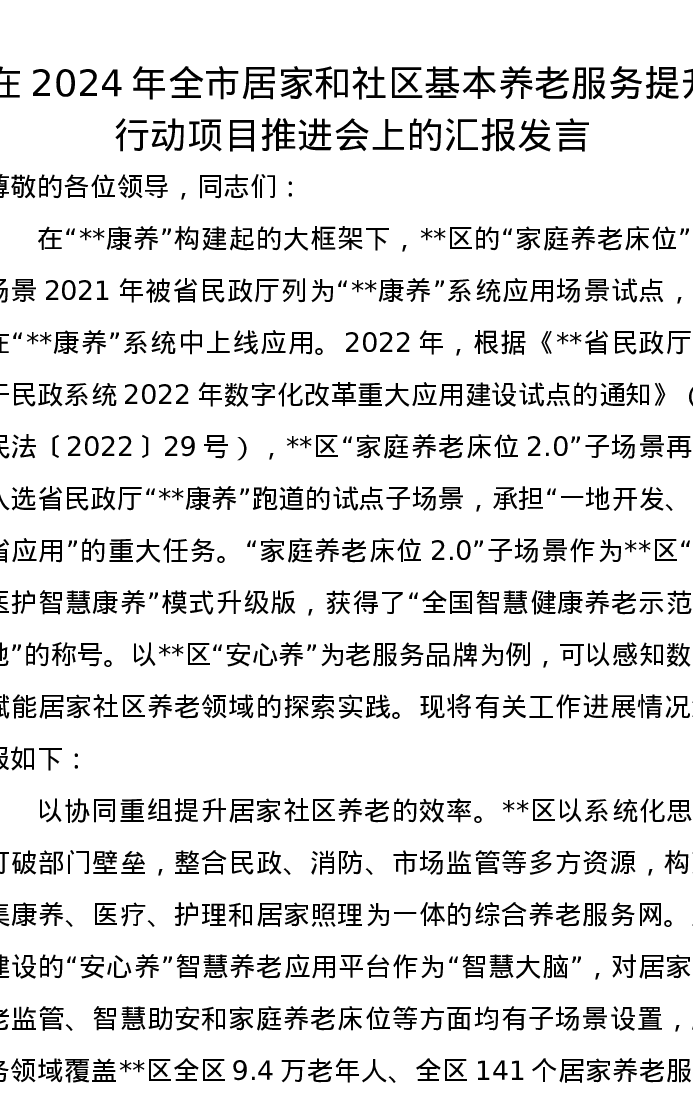 在2024年全市居家和社区基本养老服务提升行动项目推进会上的汇报发言