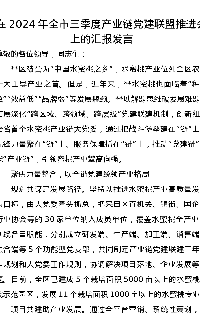 在2024年全市三季度产业链党建联盟推进会上的汇报发言
