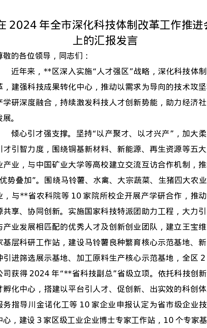 在2024年全市深化科技体制改革工作推进会上的汇报发言