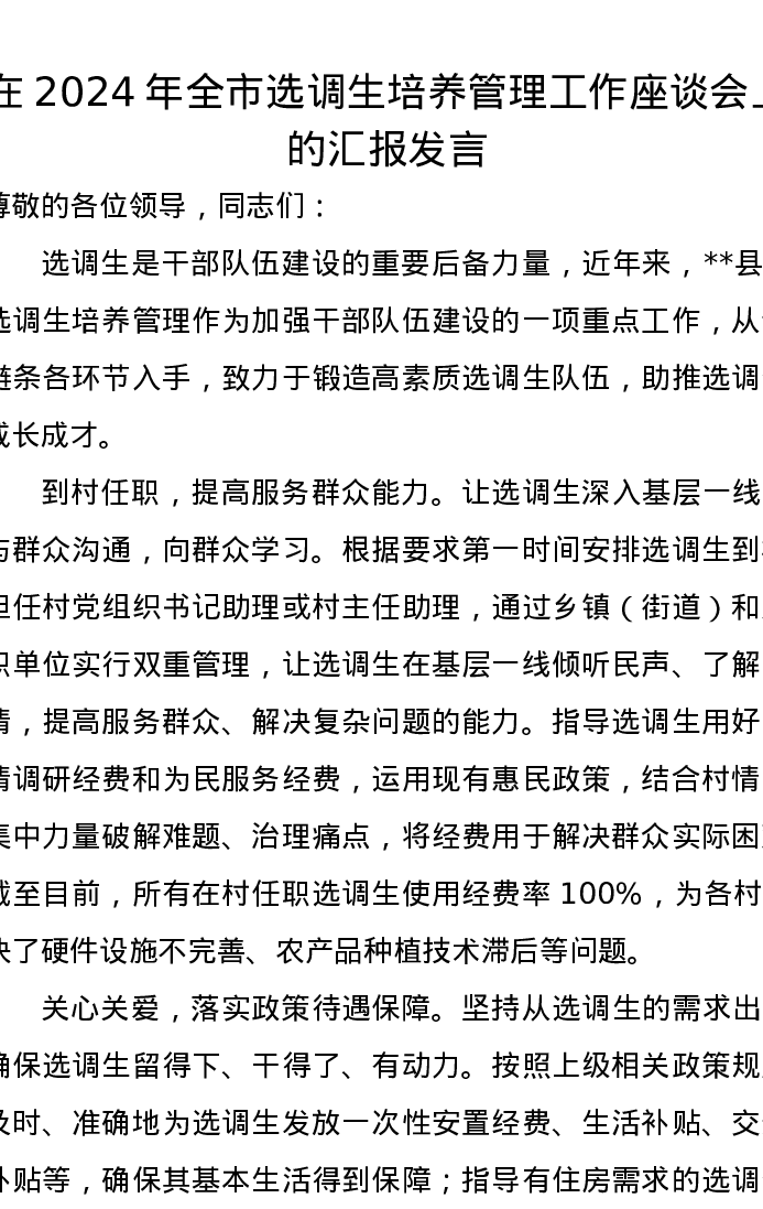 在2024年全市选调生培养管理工作座谈会上的汇报发言