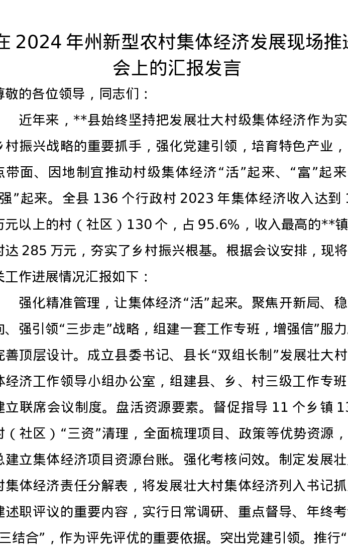 在2024年州新型农村集体经济发展现场推进会上的汇报发言