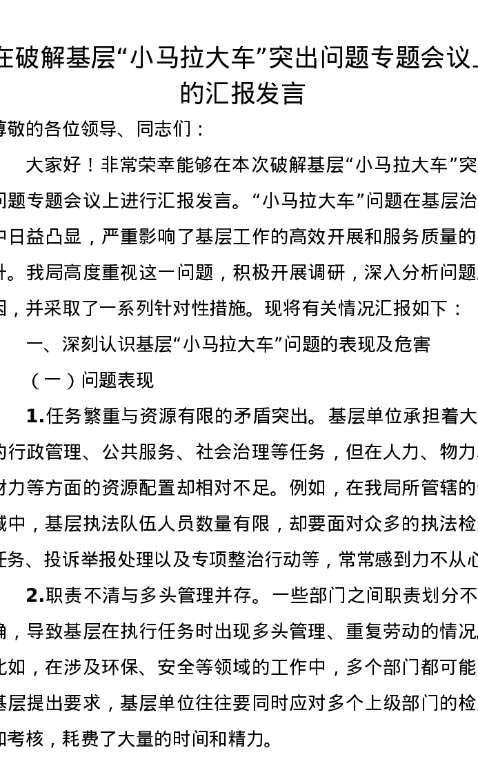 在破解基层“小马拉大车”突出问题专题会议上的汇报发言