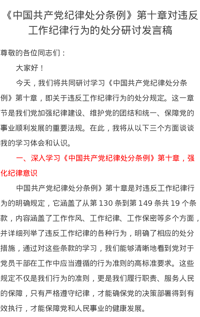 《中国共产党纪律处分条例》第十章对违反工作纪律行为的处分研讨发言稿