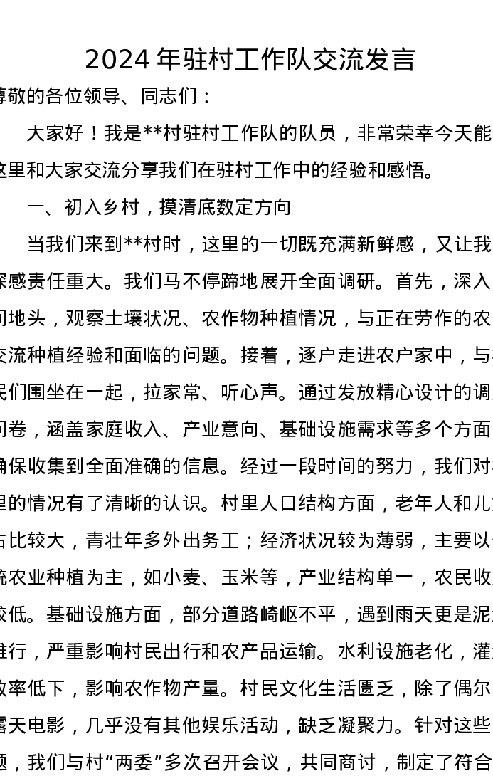 2024年驻村工作队交流发言