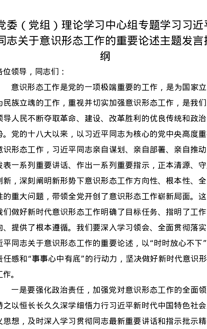 党委(党组)理论学习中心组专题学习习近平同志关于意识形态工作的重要论述主题发言提纲