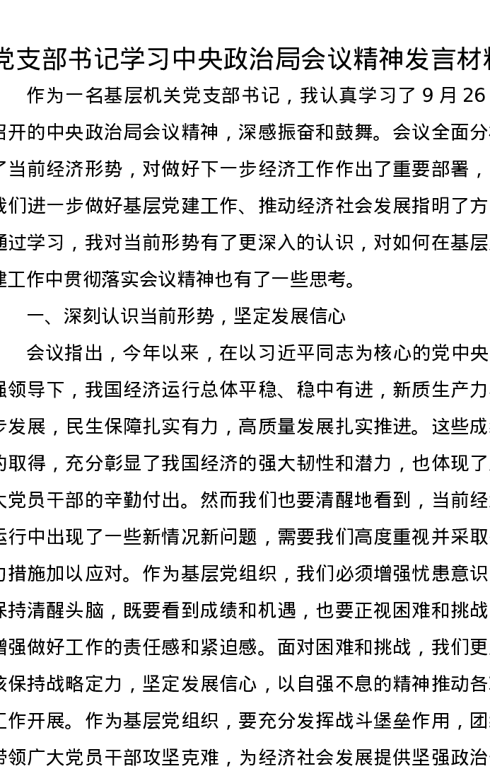 党支部书记学习中央政治局会议精神发言材料