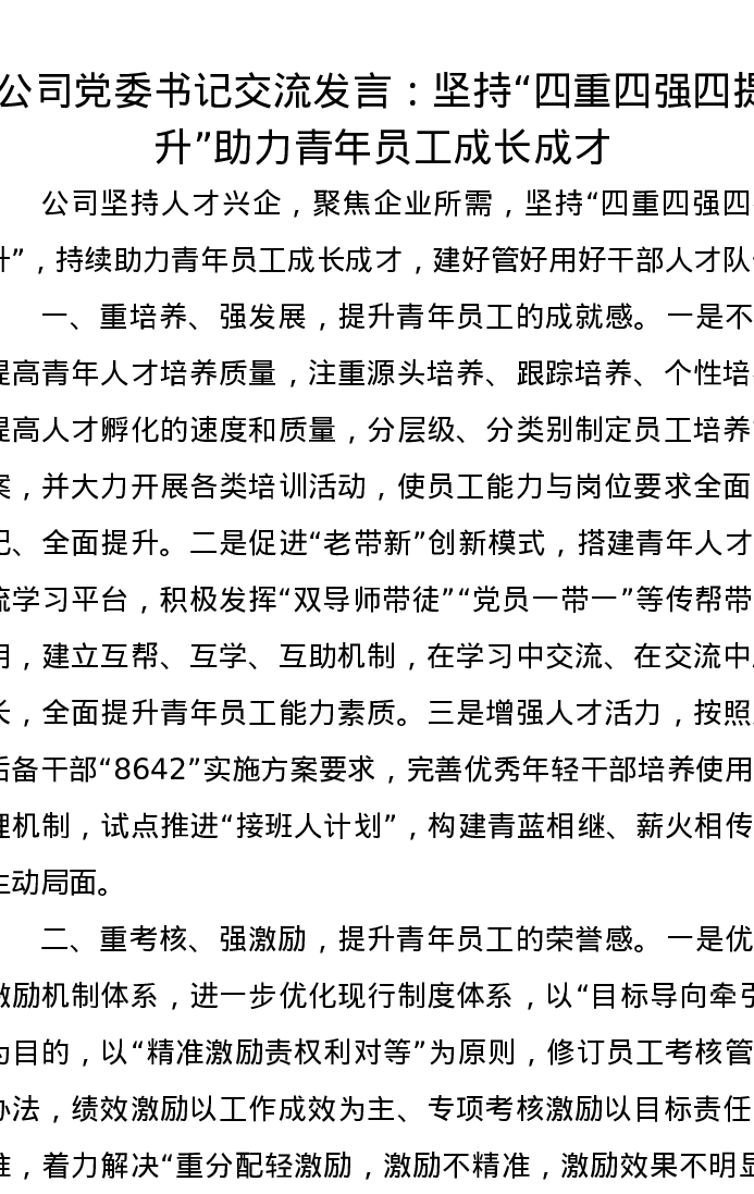 公司党委书记交流发言:坚持“四重四强四提升” 助力青年员工成长成才
