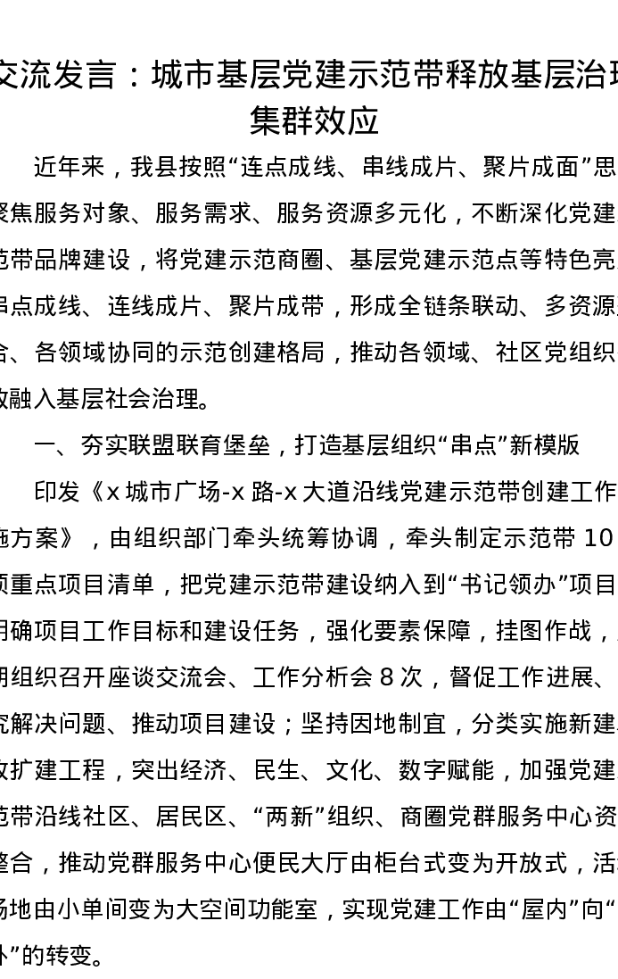 交流发言:城市基层党建示范带释放基层治理集群效应