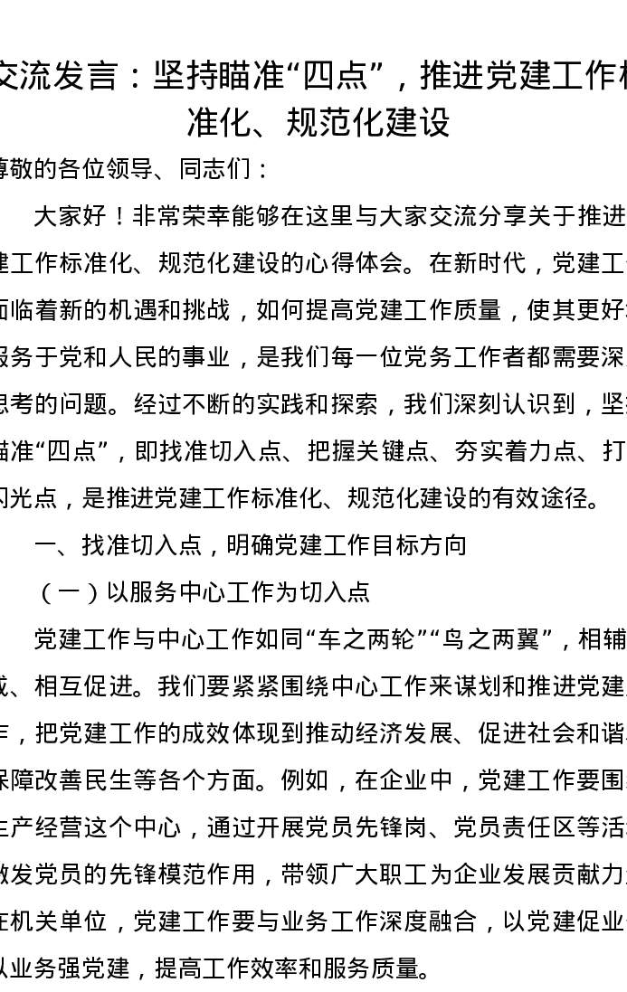 交流发言:坚持瞄准 “四点”,推进党建工作标准化、规范化建设