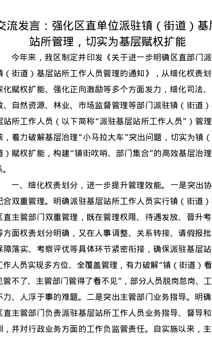 交流发言:强化区直单位派驻镇(街道)基层站所管理,切实为基层赋权扩能