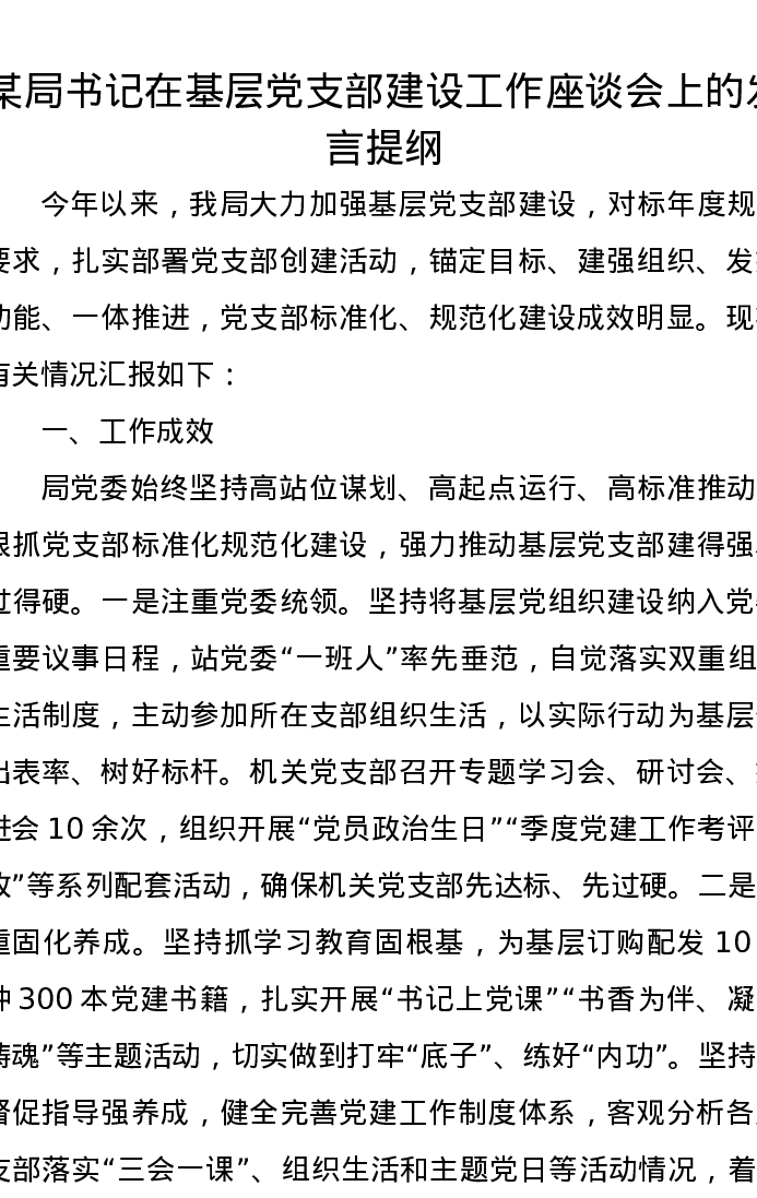 某局书记在基层党支部建设工作座谈会上的发言提纲