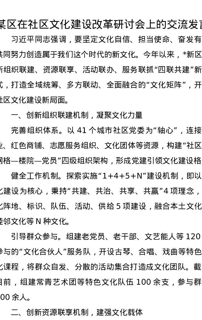 某区在社区文化建设改革研讨会上的交流发言