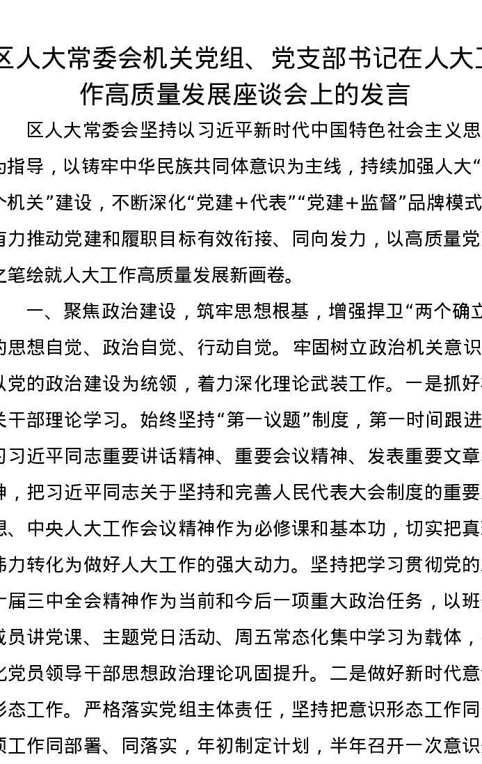 区人大常委会机关党组、党支部书记在人大工作高质量发展座谈会上的发言