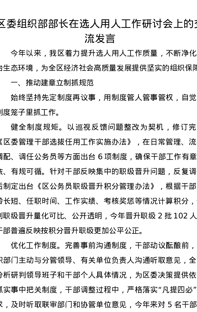 区委组织部部长在选人用人工作研讨会上的交流发言