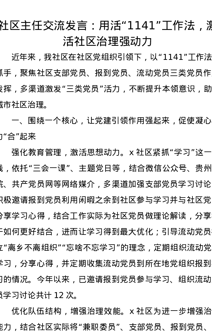 社区主任交流发言:用活“1141”工作法,激活社区治理强动力