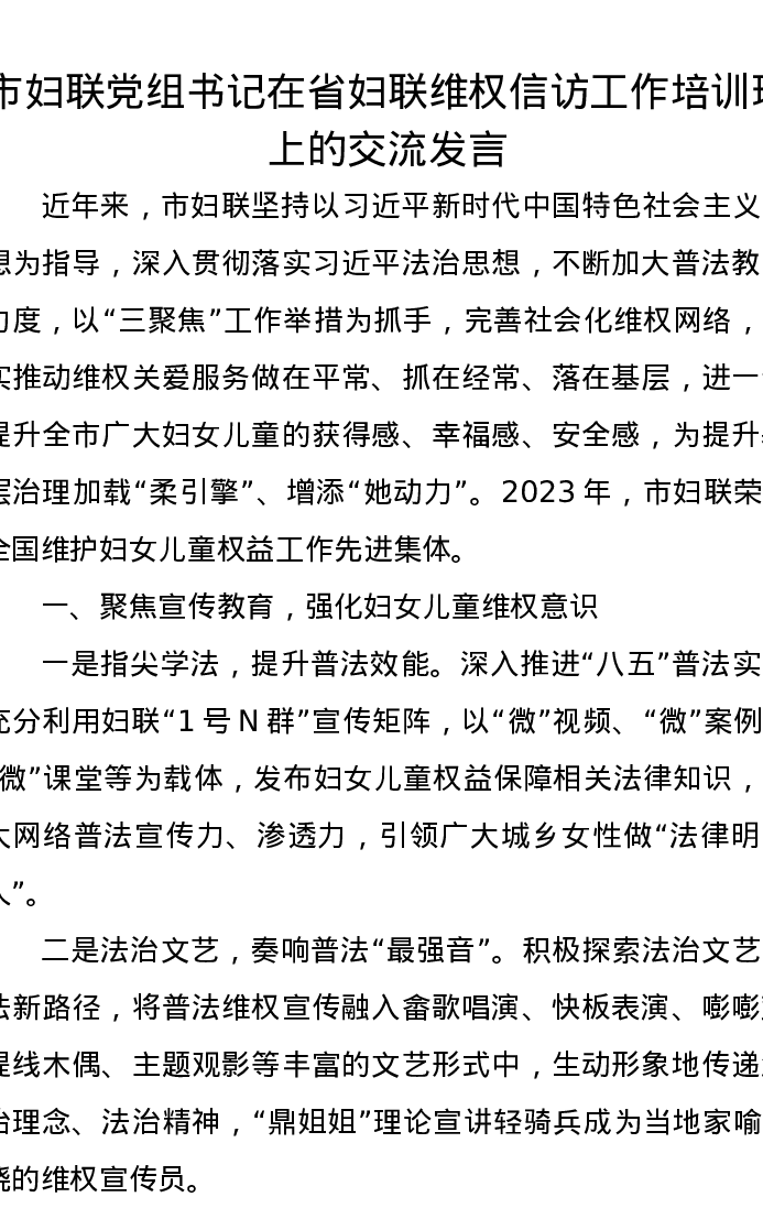 市妇联党组书记在省妇联维权信访工作培训班上的交流发言