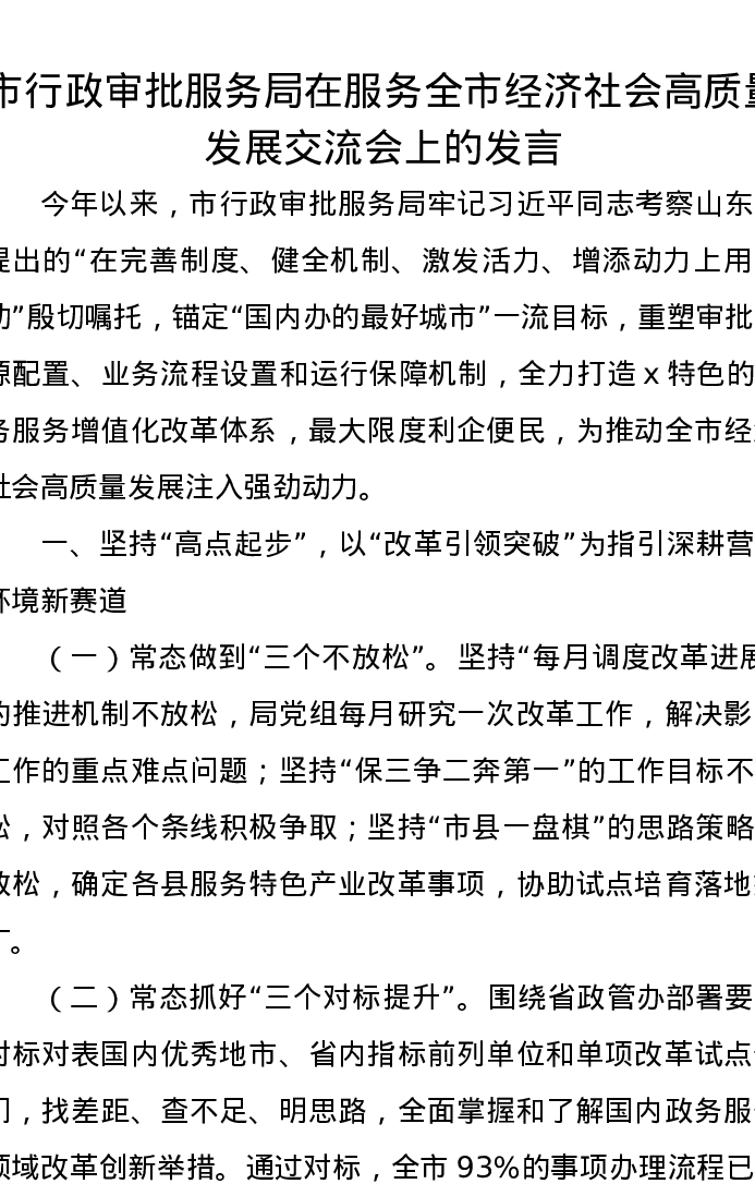 市行政审批服务局在服务全市经济社会高质量发展交流会上的发言