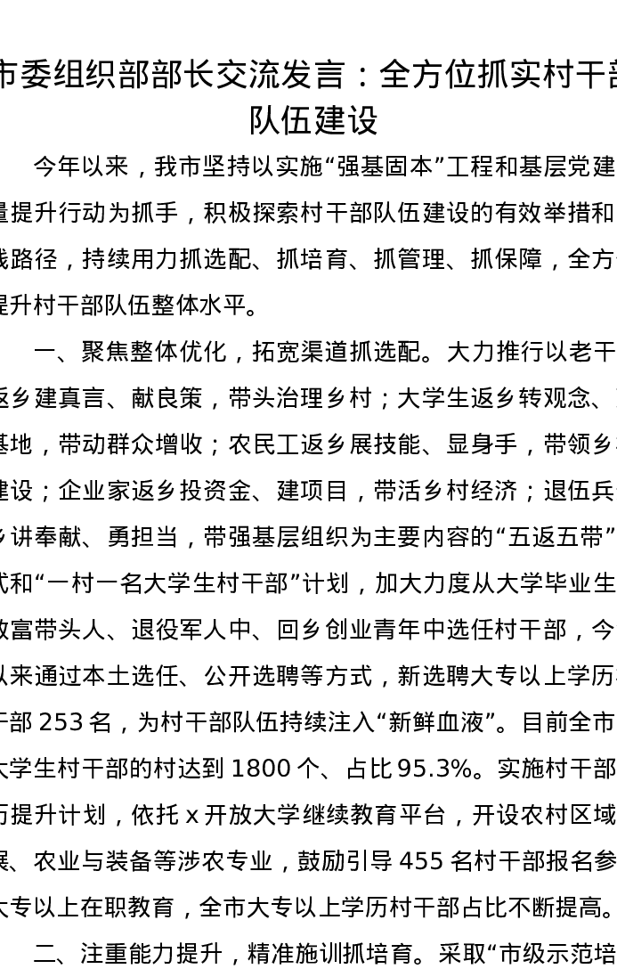 市委组织部部长交流发言:全方位抓实村干部队伍建设