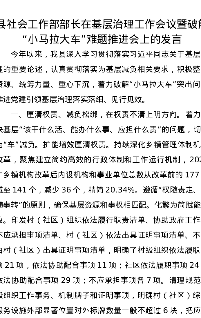 县社会工作部部长在基层治理工作会议暨破解“小马拉大车”难题推进会上的发言