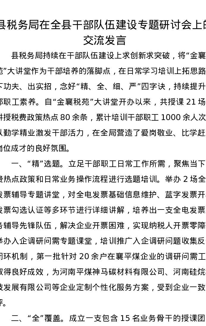 县税务局在全县干部队伍建设专题研讨会上的交流发言