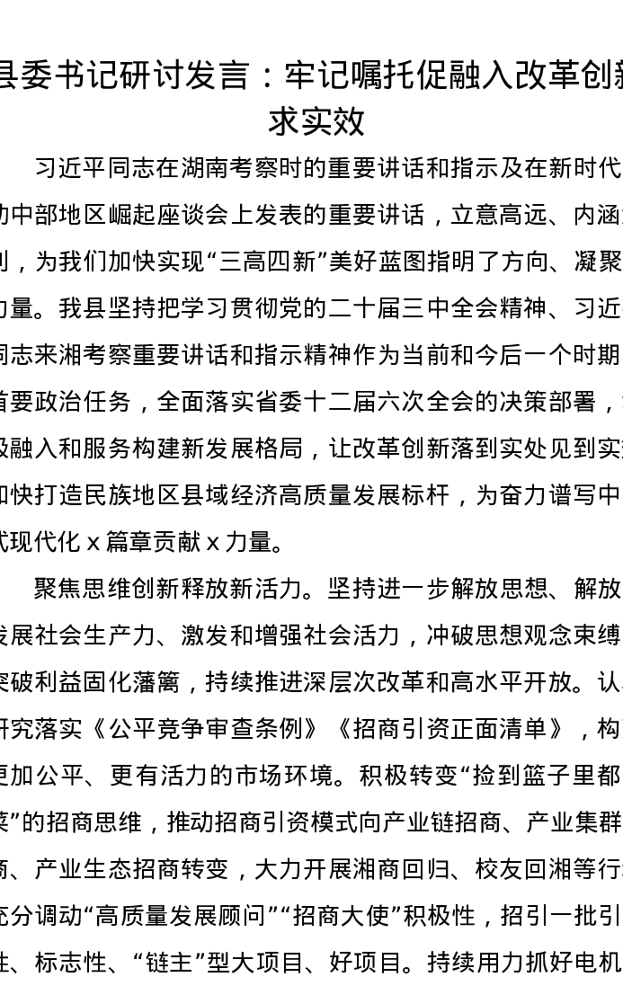县委书记研讨发言:牢记嘱托促融入 改革创新求实效