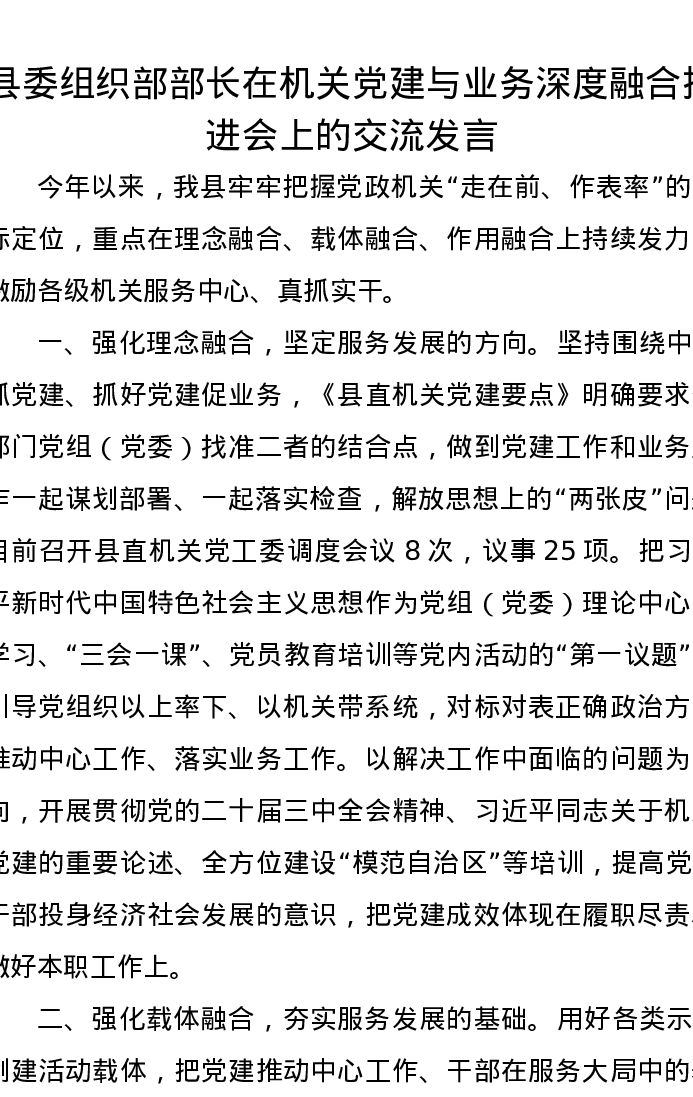 县委组织部部长在机关党建与业务深度融合推进会上的交流发言