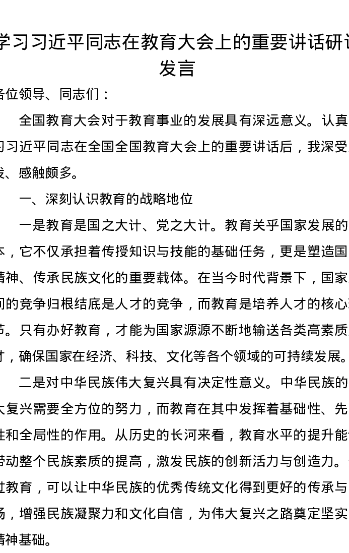 学习习近平同志在教育大会上的重要讲话研讨发言