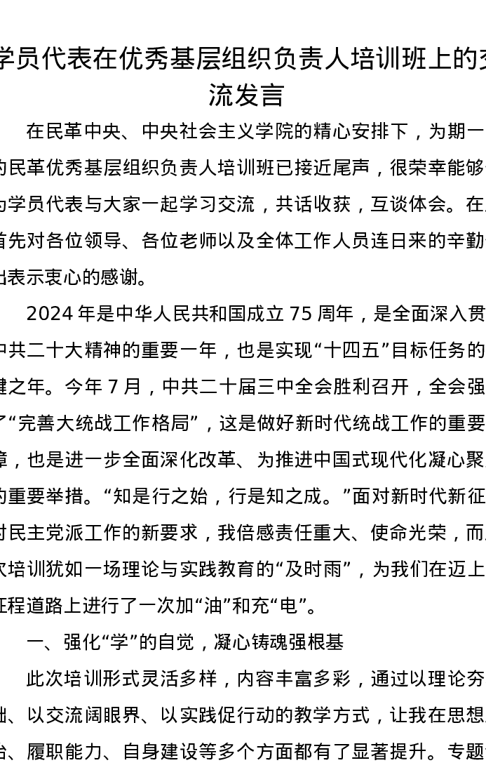 学员代表在优秀基层组织负责人培训班上的交流发言