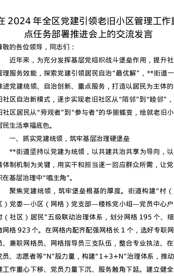 在2024年全区党建引领老旧小区管理工作重点任务部署推进会上的交流发言