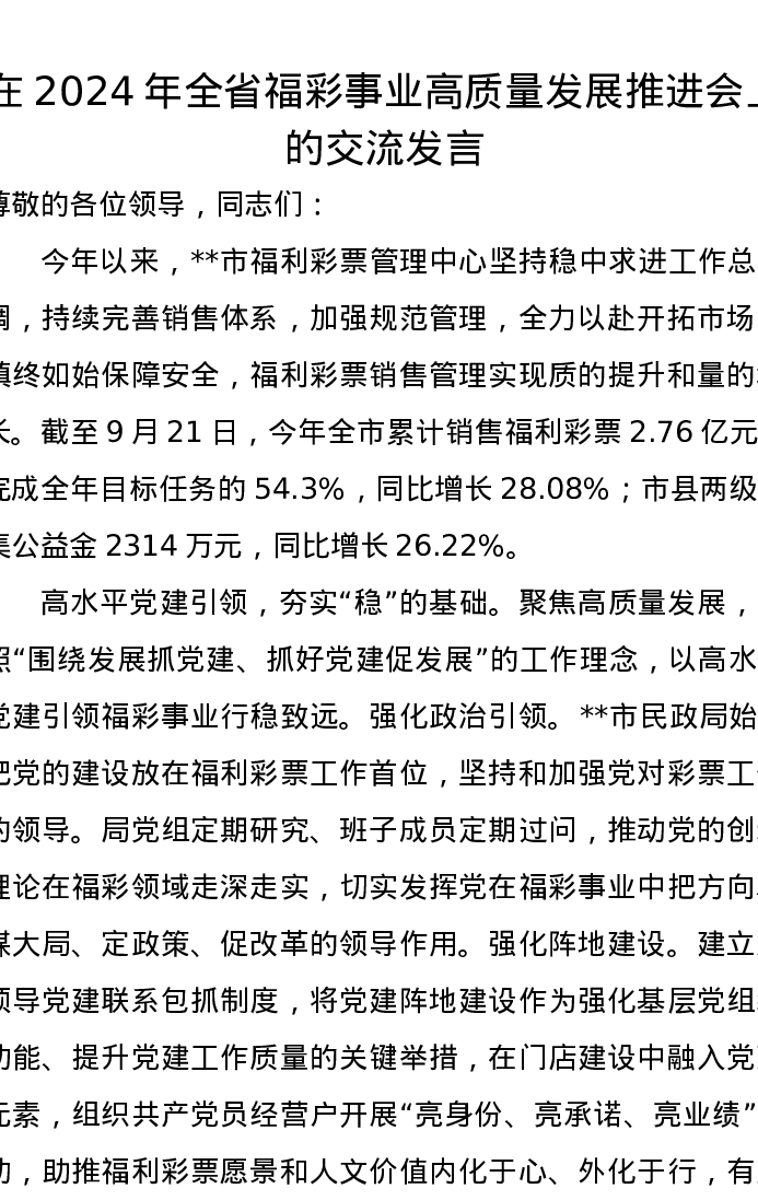 在2024年全省福彩事业高质量发展推进会上的交流发言
