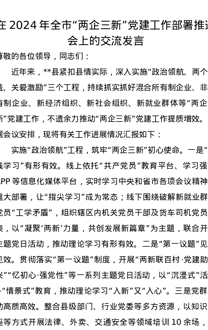 在2024年全市“两企三新”党建工作部署推进会上的交流发言