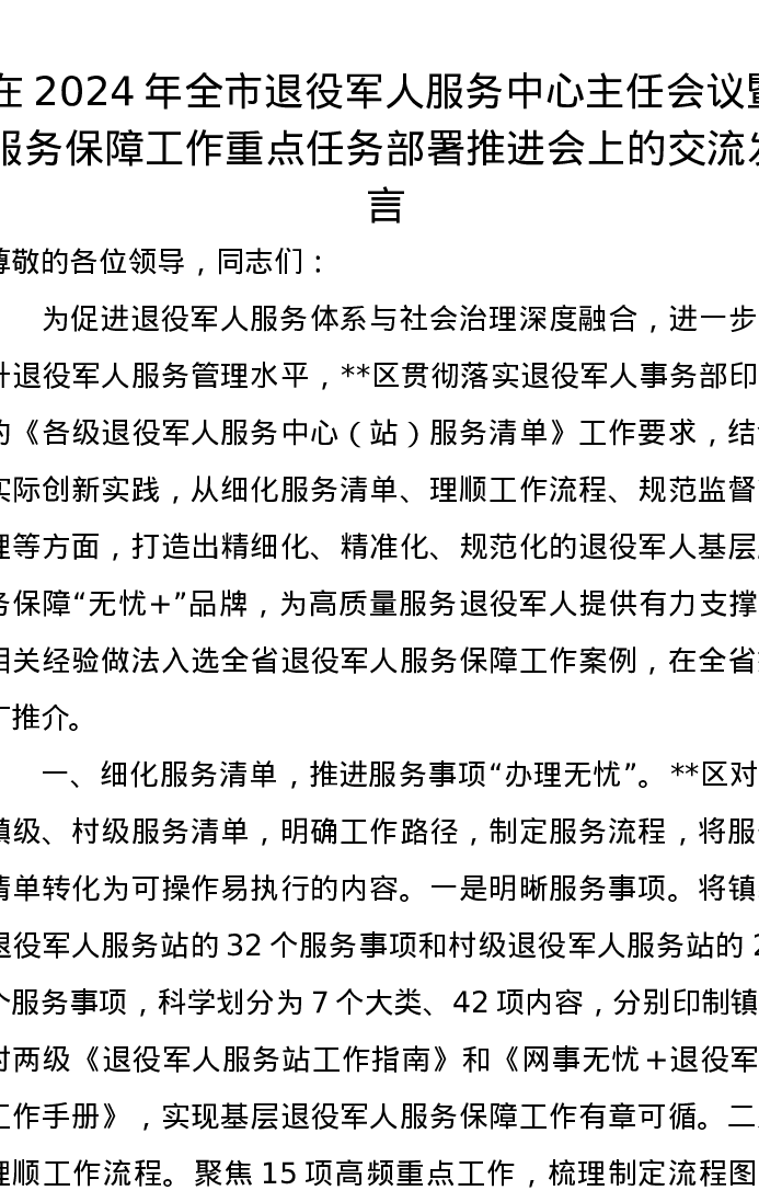 在2024年全市退役军人服务中心主任会议暨服务保障工作重点任务部署推进会上的交流发言